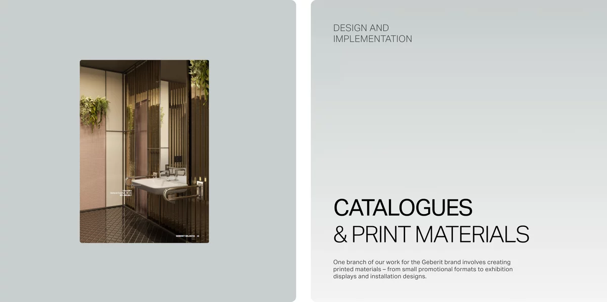 Efektem współpracy z Geberit jest spójny system komunikacji oparty na bibliotece packshotów i aranżacji łazienkowych; na ich bazie powstają key visuale i koncepcje kampanii. Dostarczane są kompletne materiały drukowane — katalogi, broszury, zestawy targowe i formaty wielkoformatowe — z pełnym nadzorem produkcyjnym, a także sezonowe materiały (Boże Narodzenie, Wielkanoc, akcje promocyjne) obejmujące KV, rendery/animacje 3D. Całość zapewnia konsekwentną, wyróżniającą komunikację w wymagającej kategorii ceramiki sanitarnej oraz szybszą, skalowalną realizację kolejnych działań.